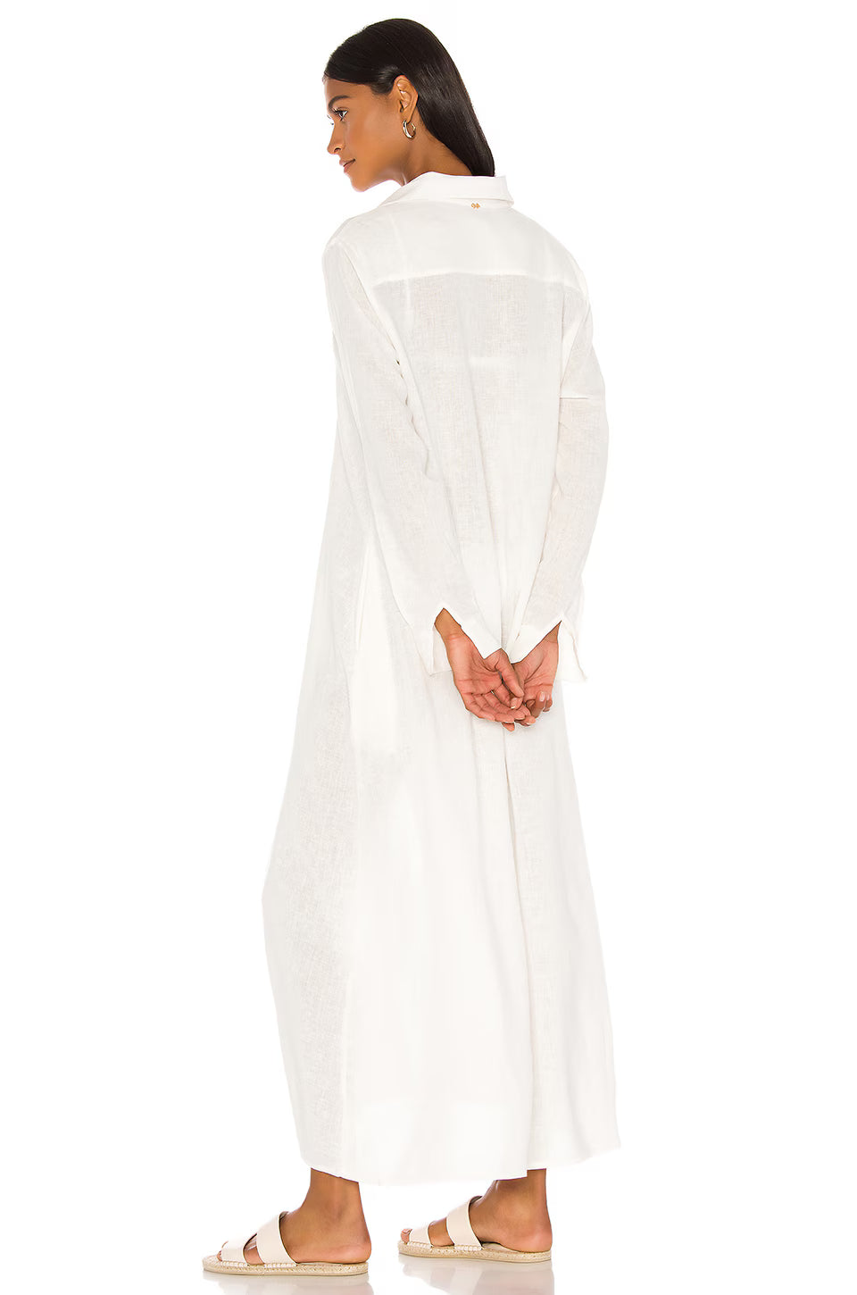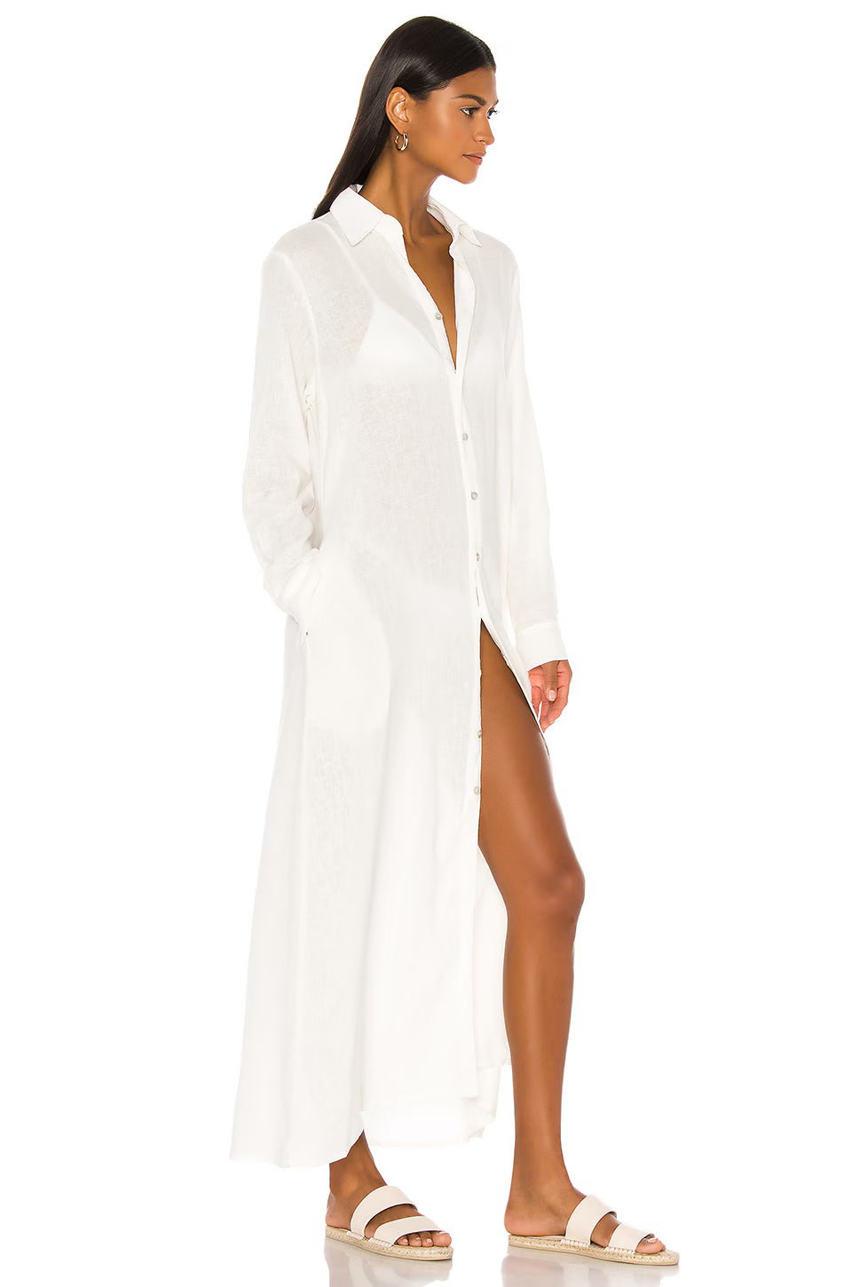 שמלת חוף לבנה מכופתרת- מתאימה פתוחה מעל בגד ים וכשמלה מכופתרת לדרינק בשקיעה.