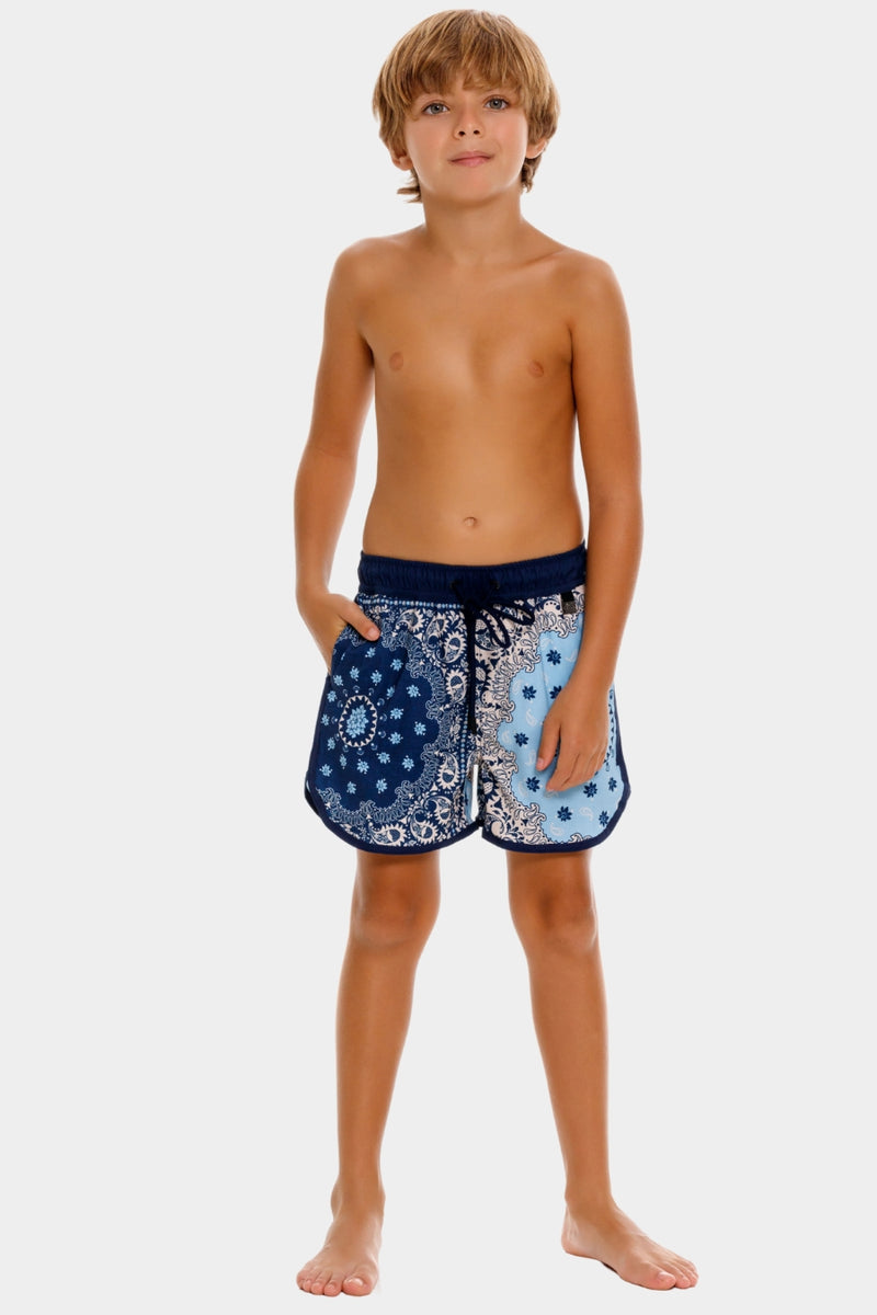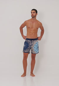 מכנסי בגד ים לגברים עם הדפס פרחוני בהשראת בנדנה בגווני כחול. עם מותן אלסטית, כיסים בצד ובגב, והתאמה נוחה, זהו פריט שמשלב סטייל קלאסי עם נוחות לכל מטרה – מהחוף ועד לשיטוט בעיר.