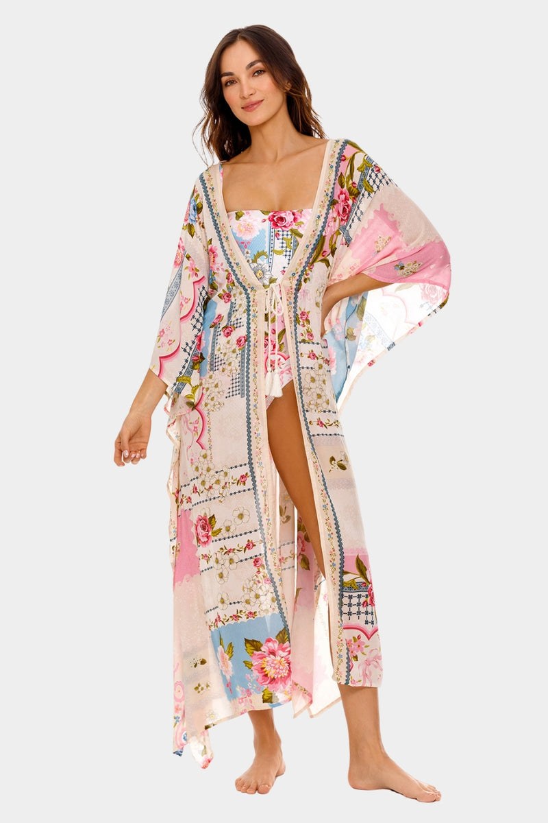תחתון ביקיני בגזרה ברזילאית עם צדדים צרים ועיטורי חרוזים ייחודיים בעבודת יד, המדגישים את הדפס הטלאים הפרחוני והמרהיב שלו.