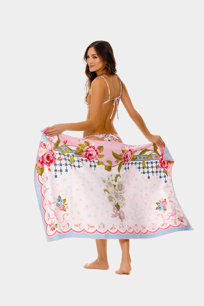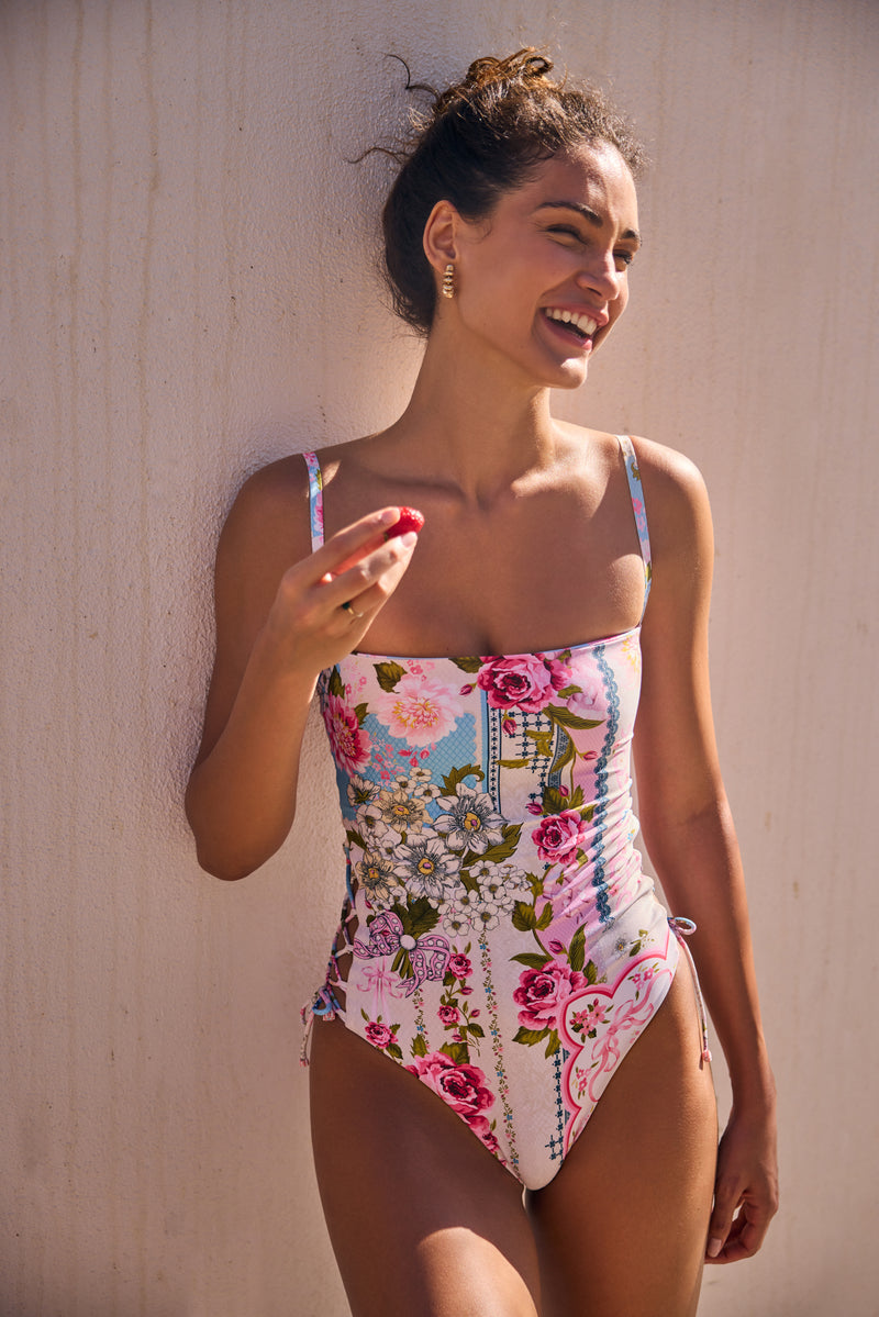 בגד ים שלם פרחוני וצבעוני, עם עיטורים, קפלים עדינים ועיצוב מכווץ וגמיש להתאמה מושלמת. הכתפיות המתכווננות מבטיחות נוחות והתאמה מושלמת למשחקים בים.